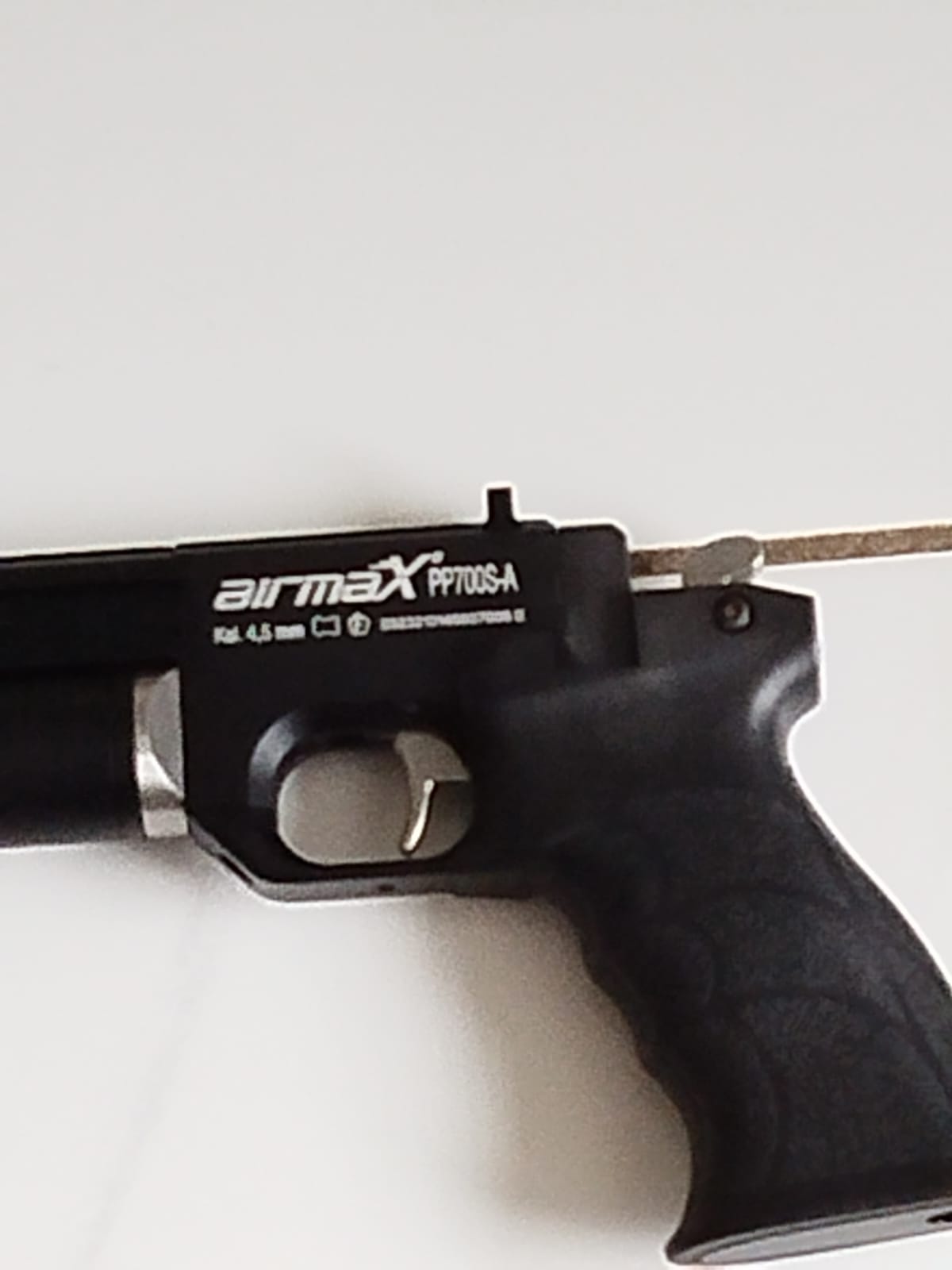 Die AirmaX PP700S-A verfügt über ein rückstoßfreies Pressluft-System. Sie hat ergonomisch geformte Griffschalen aus Kunststoff mit Fingermulden für gute Griffsicherheit. Weitere Merkmale sind ein einstellbarer Abzug, ein gezogener Lauf, eine feste Visierung und eine gefräste 11 mmm Montageschiene. Das Modell hat einen integrierten Regulator. Es wird mit Pressluft betrieben. Kapazität von 1 Schuss Diabolos im Kaliber 4,5 mm.