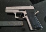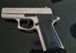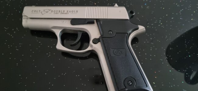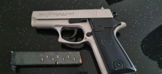 Colt Modell: Double Eagle Farbe: mattvernickelt Material: Zink-Druckguss Griffstück, mattvernickelt -Schlitten: Zink-Druckguss, mattvernickelt Kaliber: 9 mm P.A.K Knall Schusskapazität: 8 Schuss (+1) Gewicht: 1000 g Gesamtlänge: 190 mm Lauflänge: 94 mm Abzugsart: Single.- und Double-Aktion Griffschalen: schwarze Kunststoffgriffschalen Sicherung