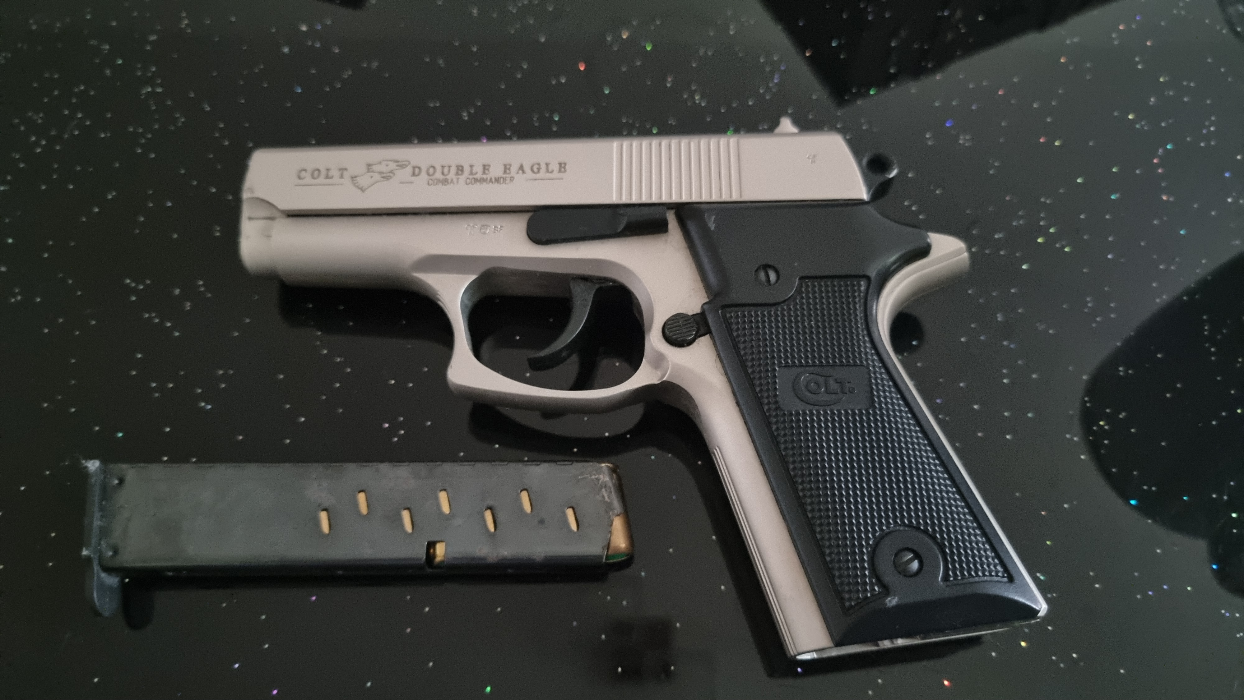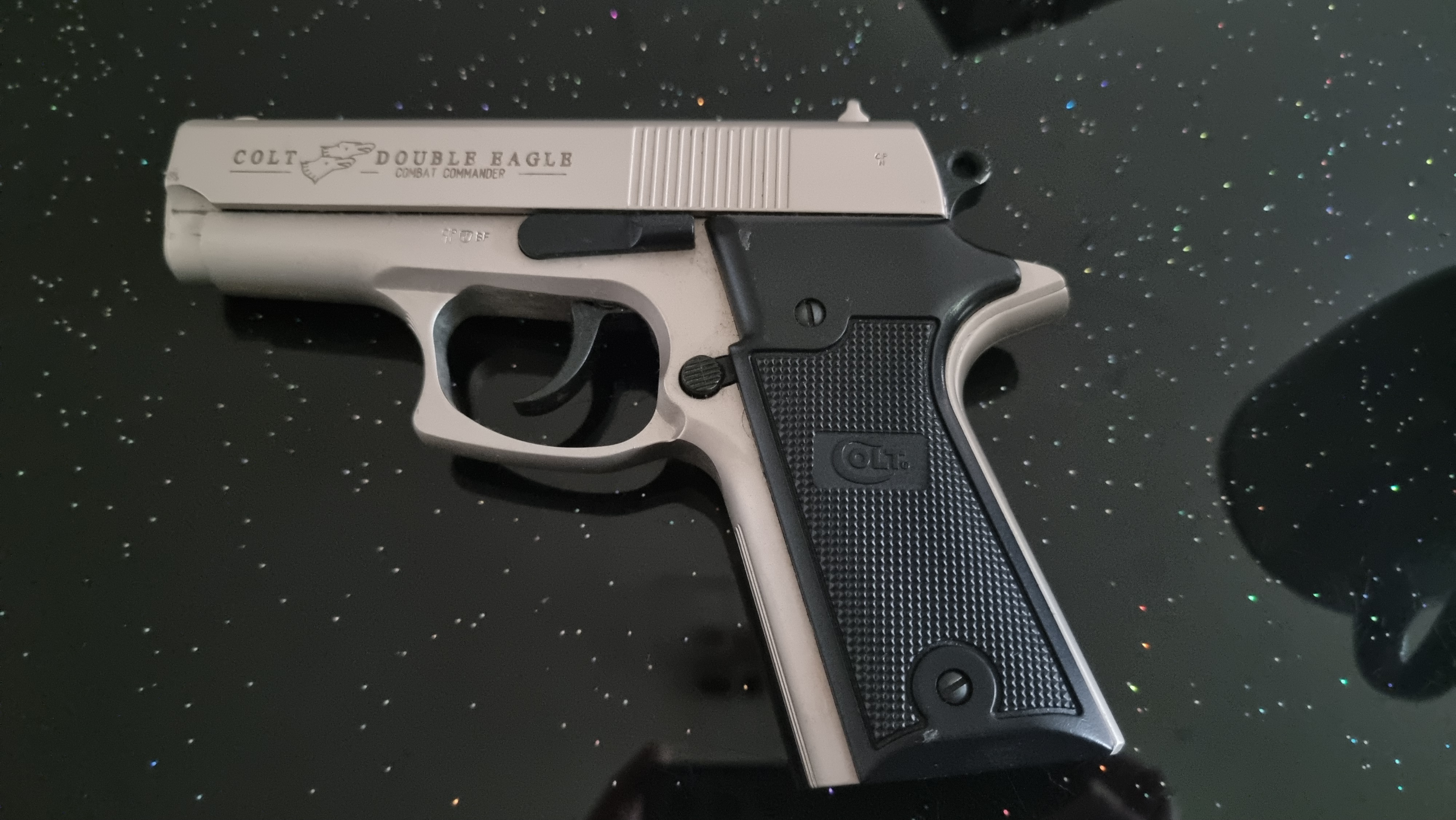 Colt Modell: Double Eagle Farbe: mattvernickelt Material: Zink-Druckguss Griffstück, mattvernickelt -Schlitten: Zink-Druckguss, mattvernickelt Kaliber: 9 mm P.A.K Knall Schusskapazität: 8 Schuss (+1) Gewicht: 1000 g Gesamtlänge: 190 mm Lauflänge: 94 mm Abzugsart: Single.- und Double-Aktion Griffschalen: schwarze Kunststoffgriffschalen Sicherung